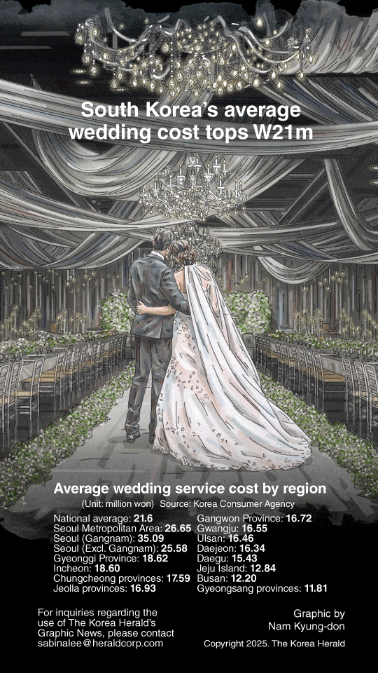 The average cost of a wedding in Korea has surpassed 21 million won ($14,700), according to a survey by the Korea Consumer Agency, which analyzed 504 wedding service providers across 14 regions. The national average in August was 21.6 million won, up from 20.74 million in June.