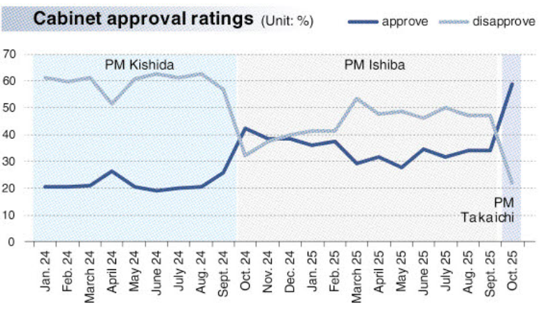 On Oct. 21, 2025, Sanae Takaichi became Japan's 104th prime minister and the country's first female leader. Takaichi is a member of the Liberal Democratic Party, which has recently lost public support due to political funding scandals and has suffered successive historic defeats in major elections. Takaichi, who served as a close aide to former Prime Minister Shinzo Abe and has clearly articulated conservative policy stances, is expected to rebuild the party's waning support and political strength in parliament. Expectations surrounding the first female prime minister also provided tailwinds, resulting in the highest approval rating for any recent prime minister in the cabinet.