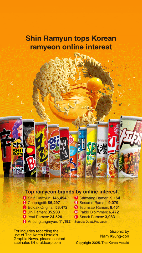 Nongshim’s instant noodle product Shin Ramyun recorded the highest consumer interest online in the third quarter of 2025, according to market research firm Data&Research, with 145,494 online mentions across news sites, communities and blogs.